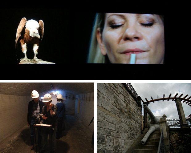 Arriba, vídeo de Allora y Calzadilla ♥. Abajo, los bunkers donde se refugiaba la población durante los bombardeos de la Segunda Guerra, transformados en espacio expositivo, y esculturas de Adrián Villar-Rojas en los antiguos viñedos de la superficie.