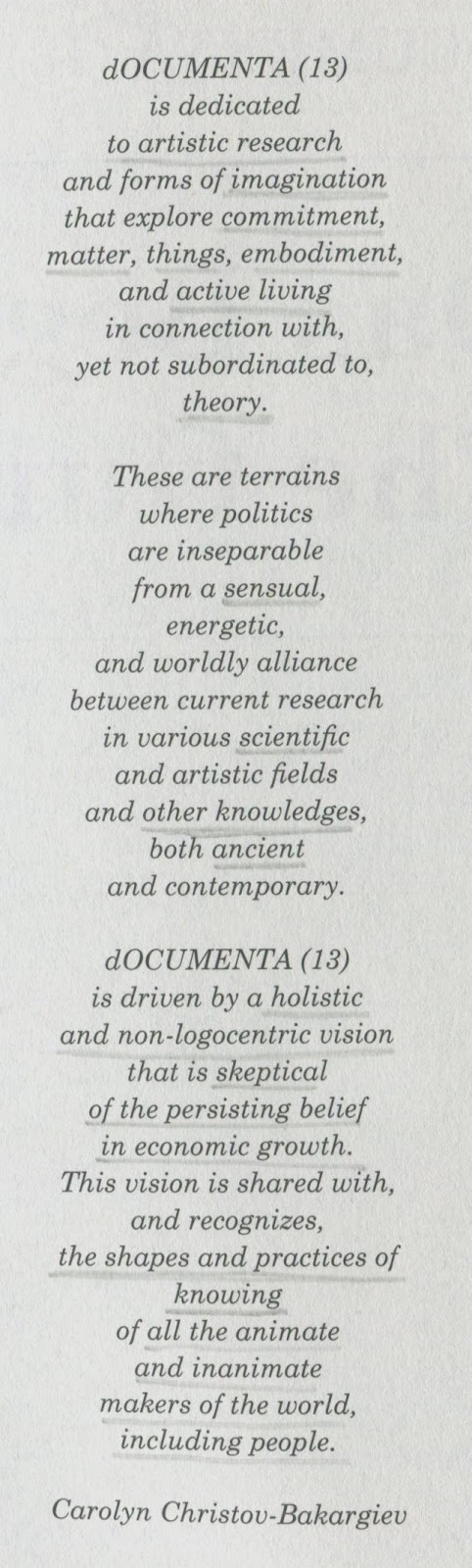 dOCUMENTA (13) propone también un regreso a la idea del arte como cura del espíritu y práctica de sanación, en la que las expresiones de vulnerabilidad son un camino para la resiliencia y la contemplación (no hacer nada, solo estar ahí, hacerse disponible) aparece como el único gesto anti-capitalista posible, el único realmente trascendente.La improductividad como acción política. El tiempo como capital y como recurso.